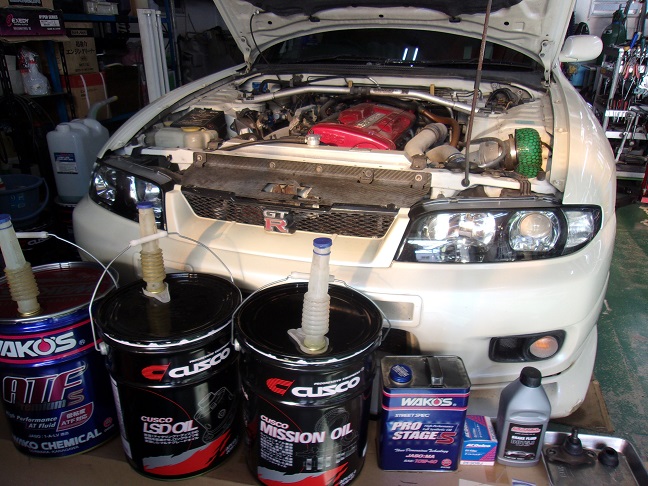 エンジンオイル&エレメント、ミッションオイル、LSDオイル、ブレーキフルード等の交換を実施いたしました。