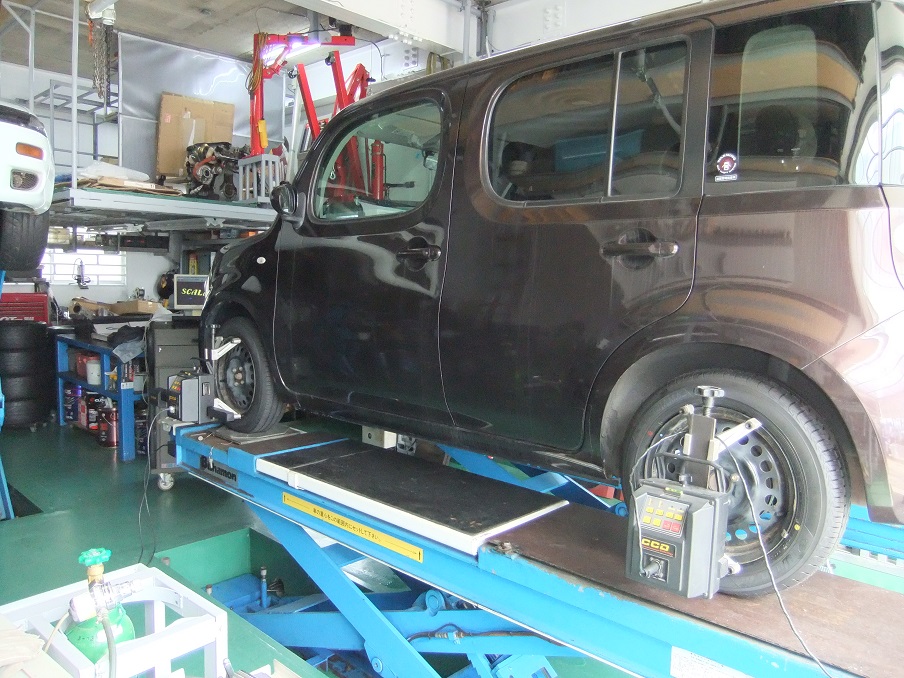 Mさんのキューブはタイヤ交換、4輪アライメント調整になります。