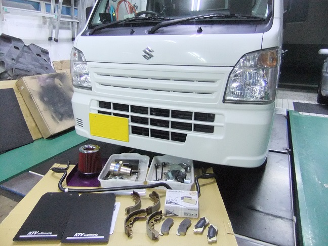 Oさんのキャリはスタビライザー装着、ブレーキパッド&シュー交換、エアクリーナー交換、マッドフラップ装着を実施いたしました。