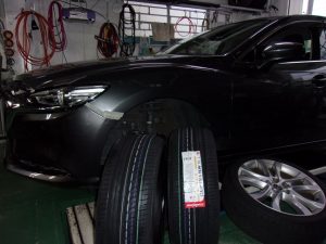 先日よりフロントマスクの後期型換装でお預かりしているKさんのアテンザはお預かり中にタイヤ交換も実施いたしました。