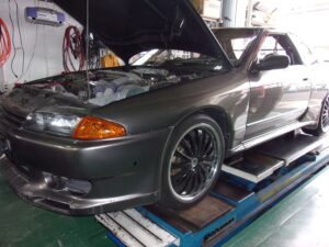 お預かりしているBNR32スカイラインGT-Rは車検整備作業を実施しております。